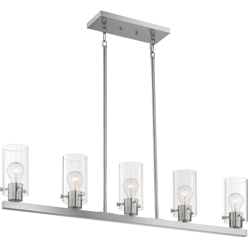 The 20″W Wired 1-Light Pendant in Brushed Nickel works well with several room themes. Its clean lines and geometric design make it a perfect fit for contemporary and minimalist interiors. The industrial elements also make it compatible with loft-style and urban chic décor. The brushed nickel finish pairs beautifully with stainless steel appliances and fixtures, making it a great choice for modern kitchens. Additionally, the clear glass shade allows the light to shine through unobstructed, enhancing the brightness and openness of the space.