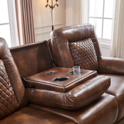 This power motion Copper Creek is upholstered in a rich color leather gel match. It features Sofa with a drop-down tray with a wireless charger. The console loveseat features a USB/AC plug inside.