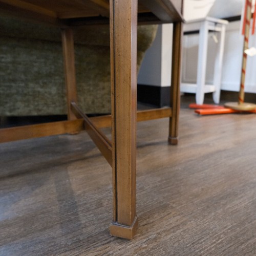 Condition Notes – this MCM Mahogany piece is accentuated with brass hardware, on top of a grass drawer pull, there are small flashes of brass on the lower corners and feet, The legs are a unique Rhombus shape, 2 tone wood top